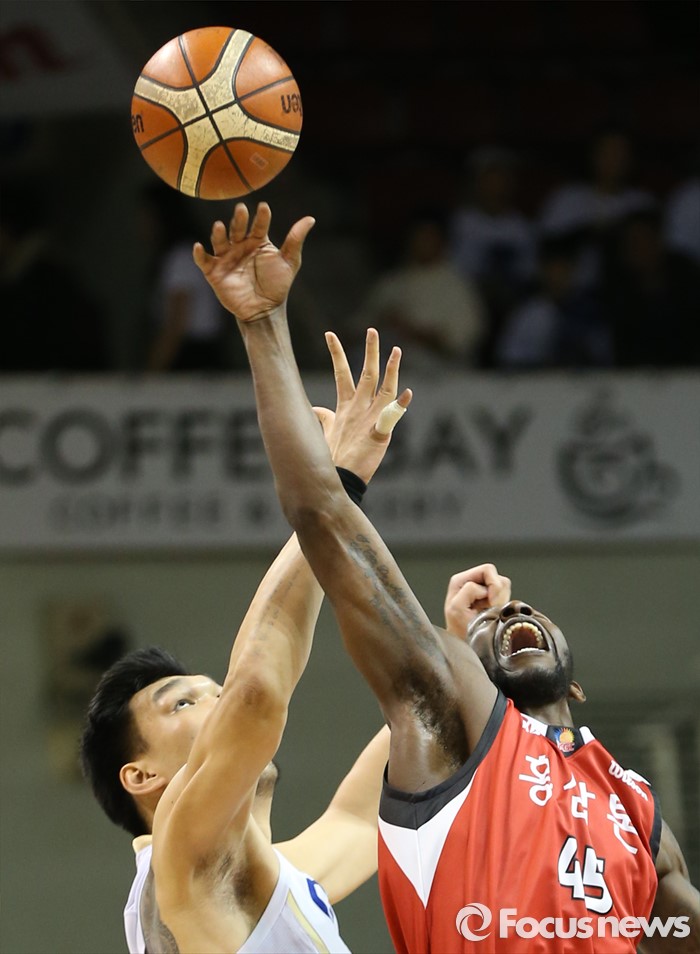 (안양=포커스뉴스) 11일 안양실내체육관에서 열린 2015-2016 프로농구 KGC-KCC 4강플레이오프 3차전에서 KGC 마리오 리틀이 KCC 하승진에 앞서 점프을 쳐내고 있다.