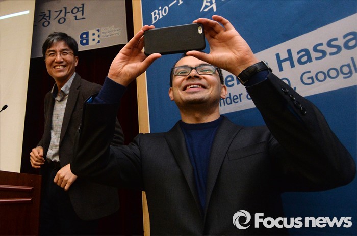 (대전=포커스뉴스) 이세돌 9단과 겨루는 인공지능 컴퓨터 알파고를 개발한 구글 딥마인드 최고경영자 데미스 하사비스가 11일 오후 대전 유성구 한국과학기술원(KAIST)에서 '인공지능과 미래' 라는 주제로 강연전 기념촬영을 하고 있다.
