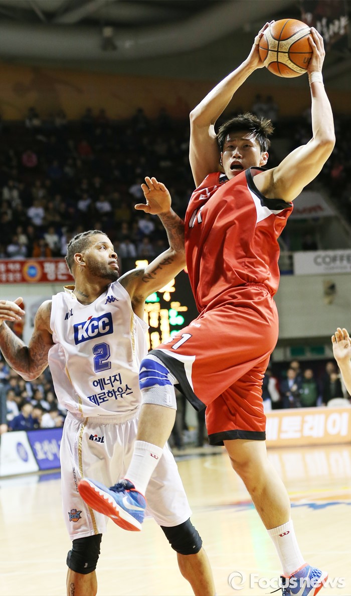 (안양=포커스뉴스) 11일 안양실내체육관에서 열린 2015-2016 프로농구 KGC-KCC 4강플레이오프 3차전에서 KGC 오세근이 리바운드볼을 잡아내고 있다.