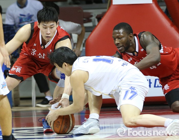 (안양=포커스뉴스) 11일 안양실내체육관에서 열린 2015-2016 프로농구 KGC-KCC 4강플레이오프 3차전에서 KCC 신명호와 KGC 오세근, 마리오 리틀이 바운드된 볼을 잡으려 달려들고 있다.