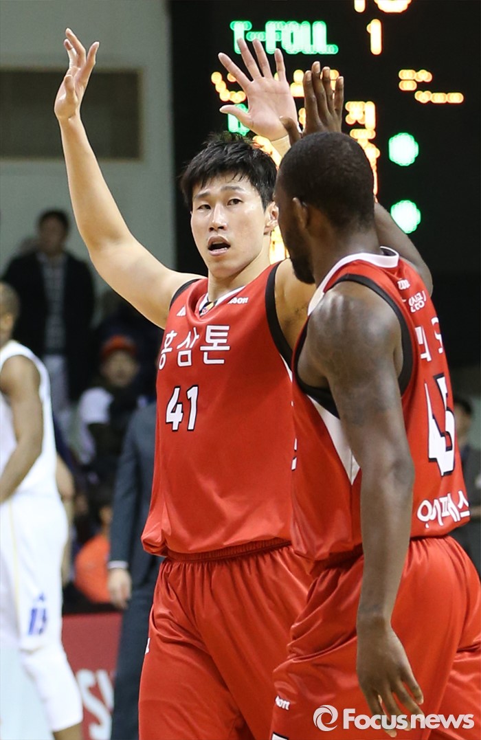 (안양=포커스뉴스) 11일 안양실내체육관에서 열린 2015-2016 프로농구 KGC-KCC 4강플레이오프 3차전에서 KGC 오세근과 마리오 리틀이 하이파이브를 하고 있다.