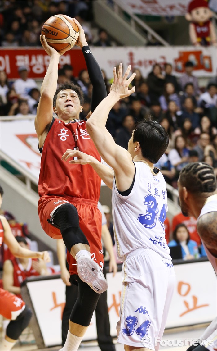 (안양=포커스뉴스) 11일 안양실내체육관에서 열린 2015-2016 프로농구 KGC-KCC 4강플레이오프 3차전에서 KGC 이정현이 KCC 김효범을 앞에 두고 점프슛을 쏘고 있다.