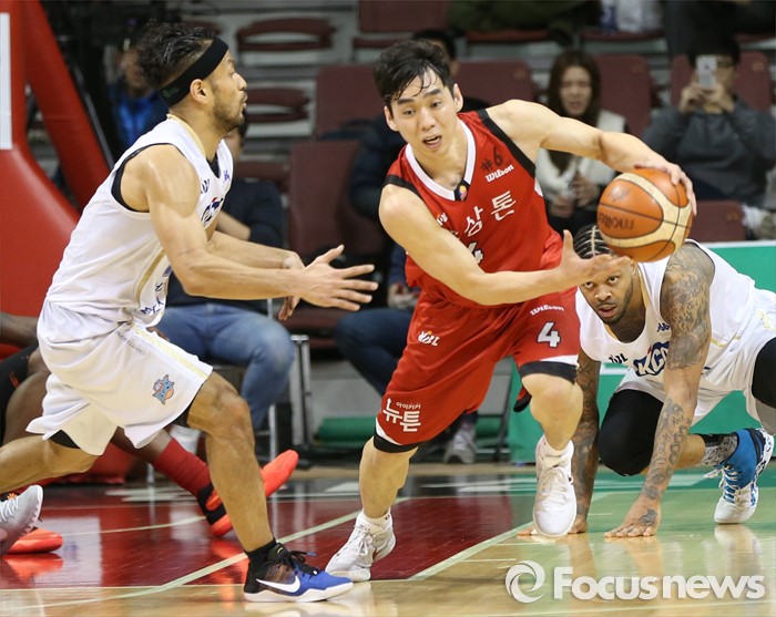 (안양=포커스뉴스) 11일 안양실내체육관에서 열린 2015-2016 프로농구 KGC-KCC 4강플레이오프 3차전에서 KGC 김윤태가 흐르는 볼을 잡아 공격에 나서고 있다. 왼쪽은 KCC 전태풍.