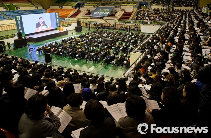 (서울=포커스뉴스) 12일 오후 서울 성동구 한양대학교 올림픽체육관에서 열린 '2017학년도 대학입시설명회'에 참석한 학부형, 수험생 및 관계자들이 주요 대학 배치참고표를 보고 있다.