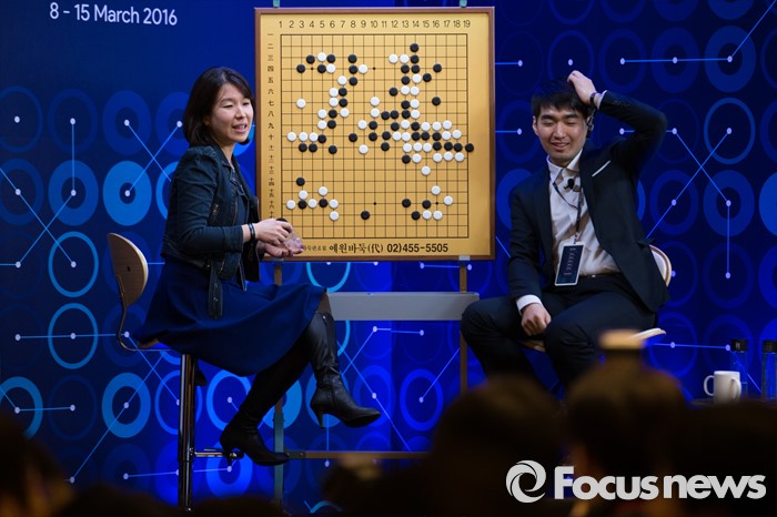 (서울=포커스뉴스) 한국 해설자들이 13일 오후 서울 종로구 포시즌스호텔에서 구글 딥마인드 챌린지 매치, 인공지능 바둑프로그램 알파고와의 네번째 대국을 해설하고 있다.