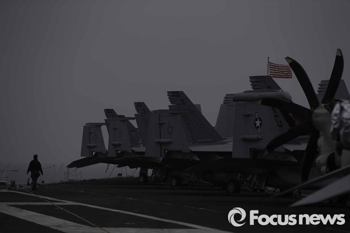 (부산=포커스뉴스) 13일 오후 부산 남구에 위치한 해군작전사령부에 입항한 존 C. 스테니스 핵항모가 취재진에게 공개되었다. 키리졸브 독수리 훈련에 참가하기 위해 한국을 찾은 스테니스항모는 길이 333m, 폭 78m,탑승 승조원은 6500명에 달하는 미 해군 핵심항모 중 하나다. 비행갑판 위로 F/A-18 호넷기들이 주기되어 있다.