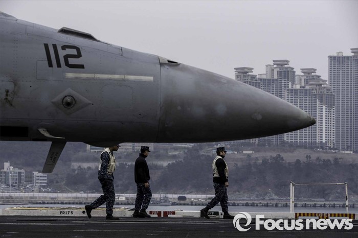 (부산=포커스뉴스) 13일 오후 부산 남구에 위치한 해군작전사령부에 입항한 존 C. 스테니스 핵항모가 취재진에게 공개되었다. 키리졸브 독수리 훈련에 참가하기 위해 한국을 찾은 스테니스항모는 길이 333m, 폭 78m,탑승 승조원은 6500명에 달하는 미 해군 핵심항모 중 하나다. 비행갑판 위의 F/A-18호넷 전투기 뒤로 부산의 아파트 단지가 보인다.