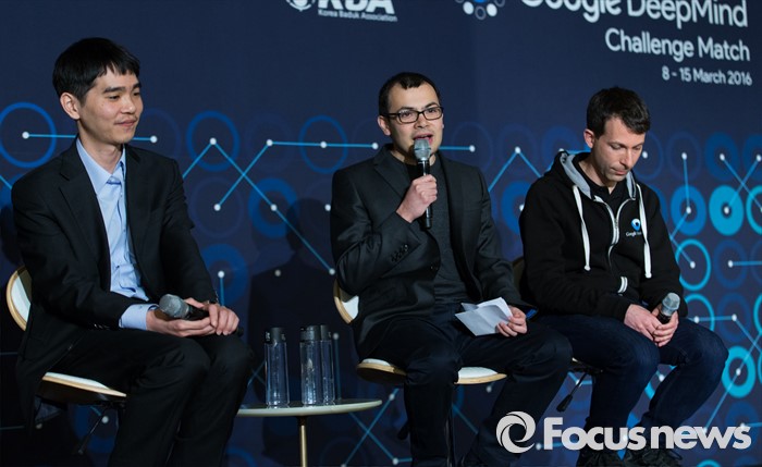 (서울=포커스뉴스) 13일 오후 서울 종로구 포시즌스호텔에서 열린 구글 딥마인드 챌린지 매치 제4국 기자회견에 참석한 데미스 하사비스(가운데) 구글 딥마인드 최고경영자가 취재진의 질문에 답하고 있다. 왼쪽부터 이세돌 9단, 데미스 하사비스, 데이비드 실버 딥마인드 리서치 담당 과학자.