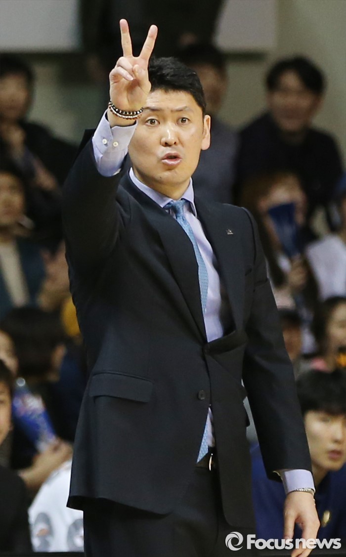 (안양=포커스뉴스) 13일 안양실내체육관에서 열린 2015-2016 프로농구 KGC-KCC 4강플레이오프 4차전에서 KCC 추승균 감독이 손가락을 펴 보이며 작전을 지시하고 있다.