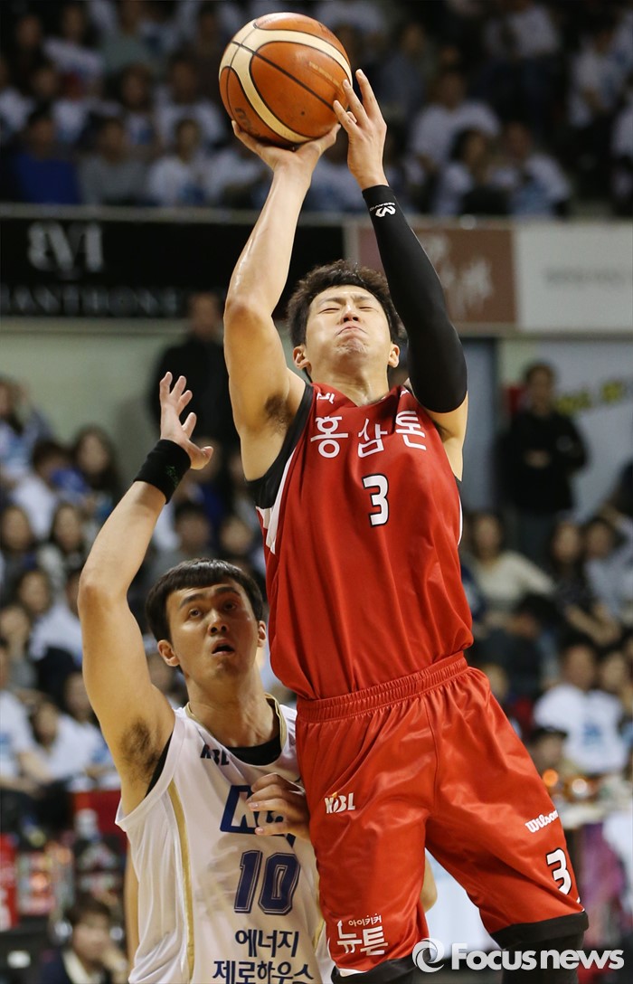 (안양=포커스뉴스) 13일 안양실내체육관에서 열린 2015-2016 프로농구 KGC-KCC 4강플레이오프 4차전에서 KGC 이정현이 KCC 김태홍의 수비를 따돌리며 점프슛을 시도하고 있다.