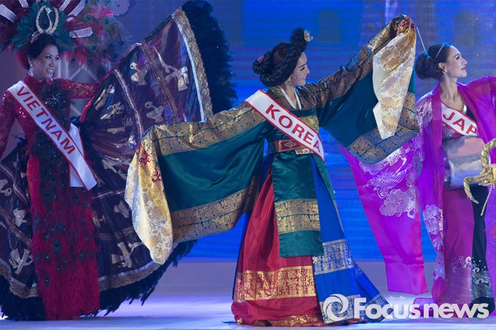 (동관/중국=포커스뉴스) 중국 광동성 동관에서 12일 오후 열린 제27회 미시즈월드 미인대회에서 각 나라의 대표 참가자들이 전통의상을 입고 춤을 추고 있다. 있다. 우승은 남아프리카 공화국의 캔디스 드보라 아브람스, 2위는 폴란드의 클라우디아 마트라크 두덱, 3위는 한국의 최은혜가 차지했다.