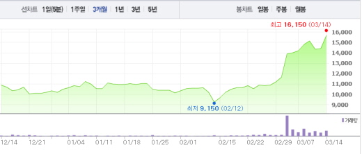 14일 오전 9시30분 현재 NEW 주가는 전일대비 9.03%(1300원) 오른 1만5700원에 거래되고 있다.