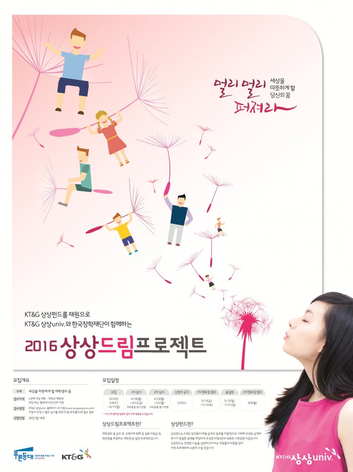 (서울=포커스뉴스) KT&G는 한국장학재단과 함께 대학생 꿈 실현 프로그램 '2016 상상드림프로젝트'의 참가자를 다음달 17일까지 모집한다고 14일 밝혔다.