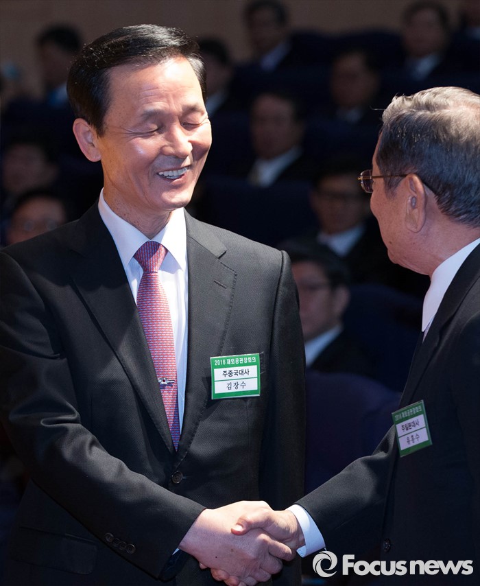 (서울=포커스뉴스) 14일 오전 서울 종로구 외교부 청사에서 열린 '2016년도 재외공관장회의'에 참석한 김장수(왼쪽) 주중대사가 유흥수 주일본대사와 악수를 나누고 있다.