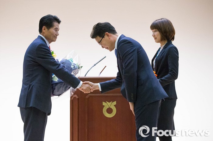 (서울=포커스뉴스) 김병원 농협 신임 회장이 14일 오전 서울 중구 농협 중앙회에서 열린 신임 회장 취임식에 참석, 직원들에게 축하 꽃다발을 받고 있다.