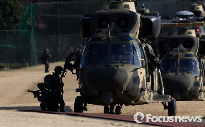 (대구=포커스뉴스) 10일 오후 제2작전사령부 예하부대에서 육군항공·특공부대 전개훈련에 참가한 201특공여단 장병들이 국산 헬기 수리온(KUH-1)을 이용해 작전지역에 침투하고 있다.