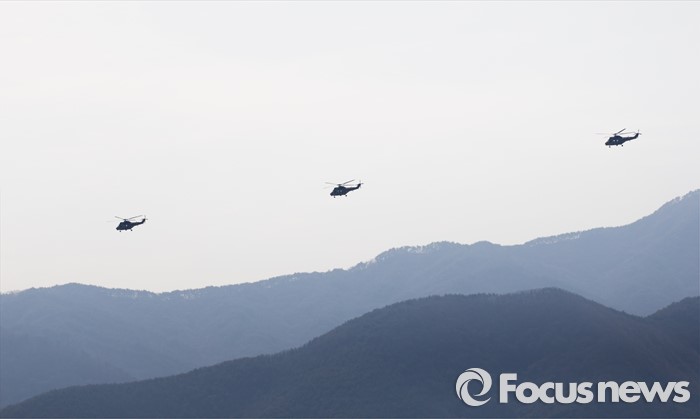 (영천=포커스뉴스) 10일 오후 제2작전사령부 예하부대에서 국산 헬기 수리온(KUH-1)이 육군항공·특공부대 전개훈련에 참가해 전술비행을 하고 있다.