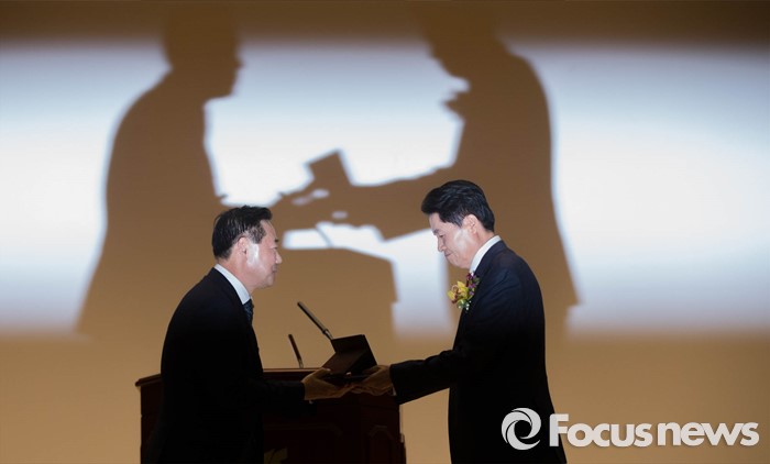 (서울=포커스뉴스) 김병원 농협 신임 회장이 14일 오전 서울 중구 농협 중앙회에서 열린 신임 회장 취임식에 참석, 회장 위임패를 받고 있다.