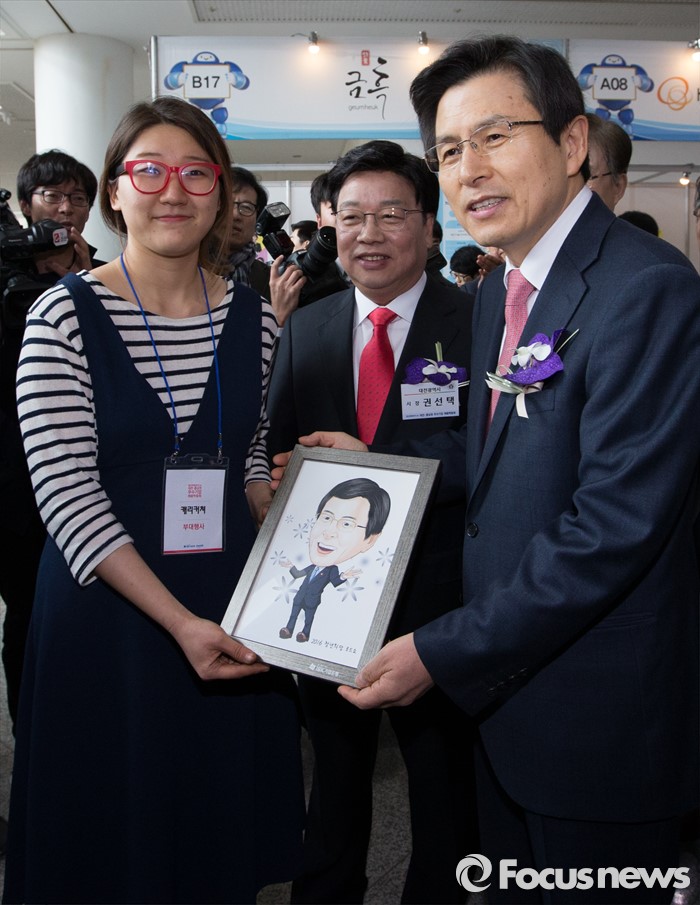 (대전=포커스뉴스) 황교안 국무총리가 14일 오전 대전시청에서 열린 청년희망로드쇼 대전·충남권 우수기업 채용박람회에 참석해 캐리커쳐를 받고 있다.