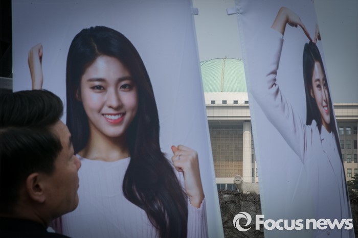 (서울=포커스뉴스) 20대 총선을 30일 앞둔 14일 오전 서울 여의도 국회 앞에서 서울시선거관리위원회 직원들이 '아름다운 선거 홍보대사'인 그룹 AOA의 설현을 모델로 제작된 가로등 현수기를 게시하고 있다.