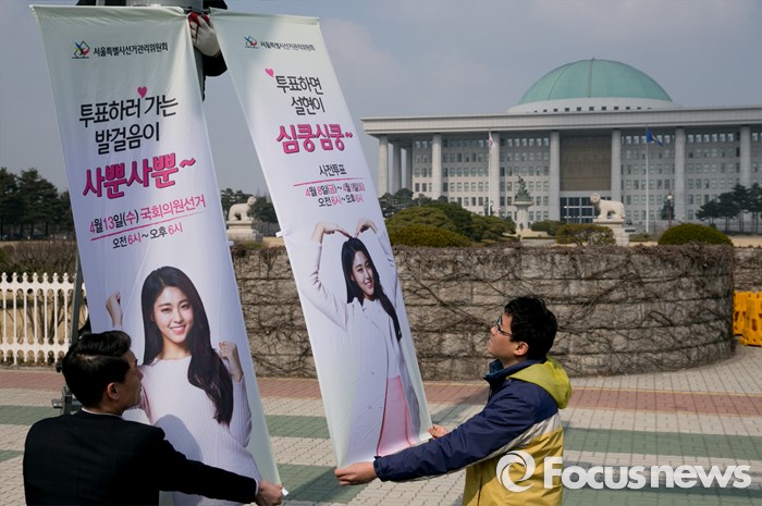(서울=포커스뉴스) 20대 총선을 30일 앞둔 14일 오전 서울 여의도 국회 앞에서 서울시선거관리위원회 직원들이 '아름다운 선거 홍보대사'인 그룹 AOA의 설현을 모델로 제작된 가로등 현수기를 게시하고 있다.