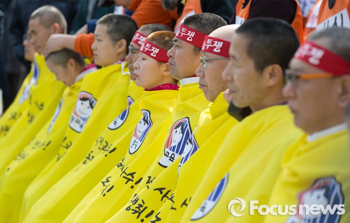 (서울=포커스뉴스) 14일 오후 서울 종로구 정부서울청사 앞에서 전국교직원노동조합 전임자들이 정부의 법외노조 후속조치와 부당탄압에 항의하며 삭발식을 하고 있다.