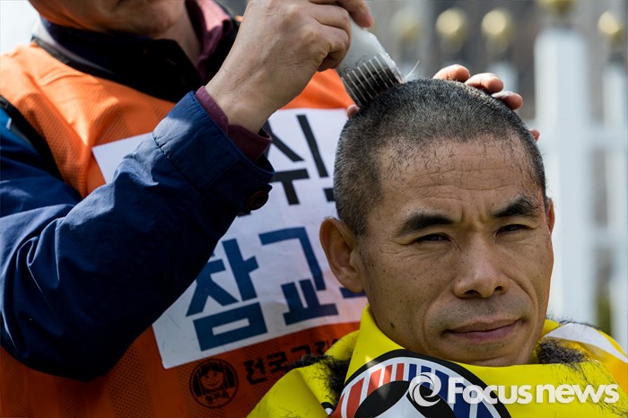 (서울=포커스뉴스) 14일 오후 서울 종로구 정부서울청사 앞에서 전국교직원노동조합 전임자들이 정부의 법외노조 후속조치와 부당탄압에 항의하며 삭발식을 하고 있다.