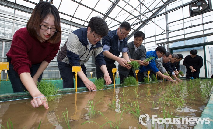 (청주=포커스뉴스) 14일 오후 충북 청주시 청원구 오창읍 충북농업기술원에서 열린 기능성 유색미 신품종 육성을 위한 첫 모내기 행사에서 박제국 충북행정부지사와 직원들이 모내기를 하고 있다.