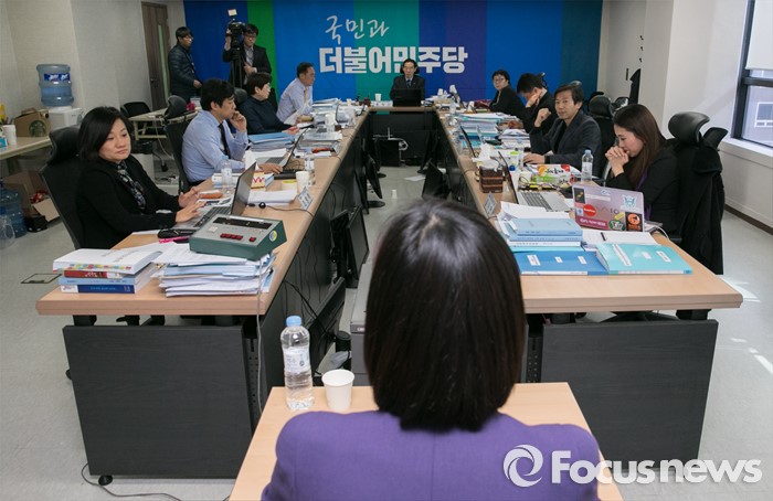 (서울=포커스뉴스) 20대 총선을 30일 앞둔 14일 오후 서울 여의도 더불어민주당사에서 열린 청년 비례대표 후보 면접에 참석한 홍창선 공천관리위원장 등 위원들이 김빈 후보의 발언을 듣고 있다.