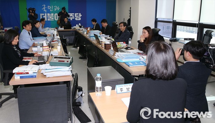 (서울=포커스뉴스) 20대 총선을 30일 앞둔 14일 오후 서울 여의도 더불어민주당사에서 열린 청년 비례대표 후보 면접에 참석한 홍창선 공천관리위원장 등 위원들이 이신혜 후보의 발언을 듣고 있다.