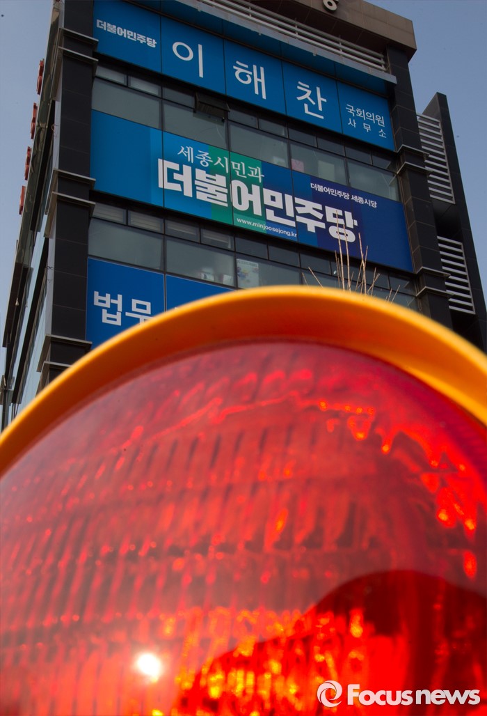 (세종=포커스뉴스) 이해찬 더불어민주당 의원이 14일 컷오프에서 탈락하면서 지지자들이 강력히 반발하고 있는 가운데 세종시당에서 지지자들이 대책회의를 열었다. 더민주 세종시당 앞에 빨간등이 보이고 있다.
