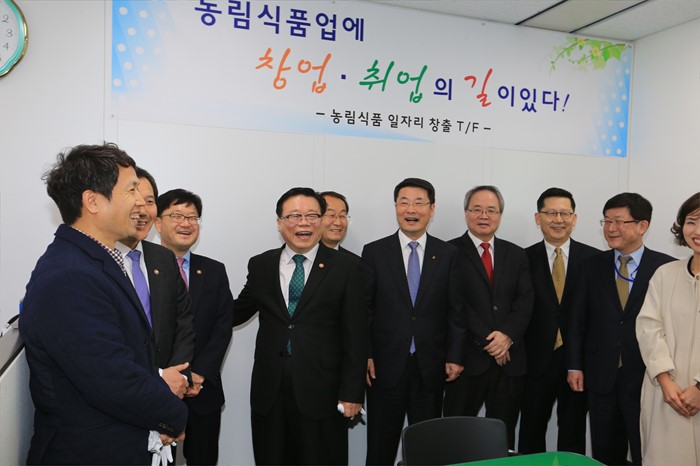 (세종=포커스뉴스) 이동필 농림축산식품부장관이 14일 세종시 정부세종청사 농식품부에서 열린 농림식품 일자리 창출 T/F 현판식에 참석해 사무실을 둘러보며 직원을 격려하고 있다. <사진제공=농림축산식품부>
