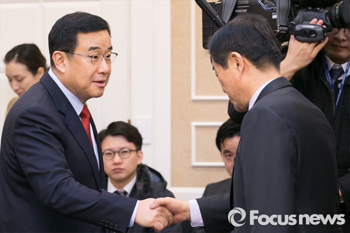 (서울=포커스뉴스) 김정훈(왼쪽) 새누리당 정책위의장과 황인무 국방부 차관이15일 오전 서울 여의도 국회 귀빈식당에서 열린 안보상황 점검 긴급 당정협의에 참석해 악수하고 있다.