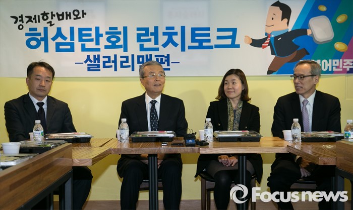 (서울=포커스뉴스) 김종인(왼쪽 두번째) 더불어민주당 비대위 대표가 15일 오후 서울 여의도 한 카페에서 열린 경제할배와 허심탄회 런치토크 - 샐러리맨편 행사에 참석해 인사말을 하고 있다. 오른쪽 첫번째는 주진형 총선정책공약단 부단장.