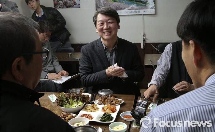 (서울=포커스뉴스) 15일 오후 서울 마포구 연남동 한 기사식당에서 안철수 국민의당 상임공동대표가 택시기사와 간담회를 갖고 있다.
