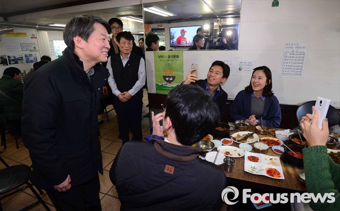 (서울=포커스뉴스) 15일 오후, 택시 기사들과 간담회를 갖기 위해 서울 마포구 연남동 한 기사식당을 방문한 안철수 국민의당 상임공동대표가 식당 손님들에게 인사 하고 있다.