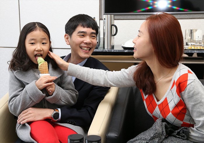 (서울=포커스뉴스) 바둑기사 이세돌(가운데) 9단이 15일 오후 서울 광화문 포시즌스호텔에서 열린 구글 딥마인드 챌린지 매치에 참석해 인공지능 바둑프로그램 알파고와의 마지막 대국을 기다리며 아내 김현진(오른쪽) 씨, 딸 혜림양과 대화하고 있다. <사진제공=구글>