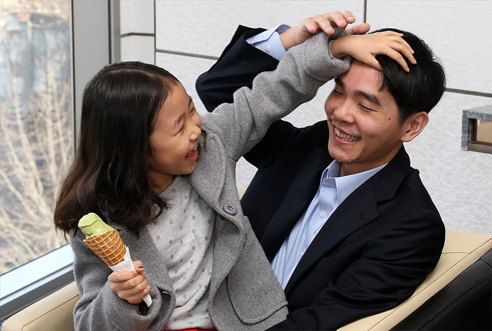 (서울=포커스뉴스) 바둑기사 이세돌(오른쪽) 9단이 15일 오후 서울 광화문 포시즌스호텔에서 열린 구글 딥마인드 챌린지 매치에 참석해 인공지능 바둑프로그램 알파고와의 마지막 대국을 기다리며 딸 혜림양과 대화하고 있다. <사진제공=구글>