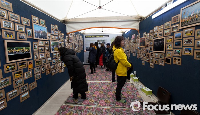 (서울=포커스뉴스) 15일 오후 서울 광화문광장에서 416가족협의회와 4.16연대가 세월호 700일 기획전시 개관식 및 2주기 추모의 달 공표 기자회견 후 기획전시관을 살펴보고 있다.