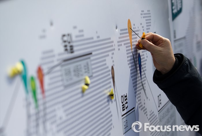 (서울=포커스뉴스) 15일 오후 서울 광화문광장에서 세월호 416가족협의회와 4.16연대가 세월호 700일 기획전시 개관식 및 2주기 추모의 달 공표 기자회견 후 지도에 리본을 달며 세월호 사고를 기억하자는 퍼포먼스를 하고 있다.