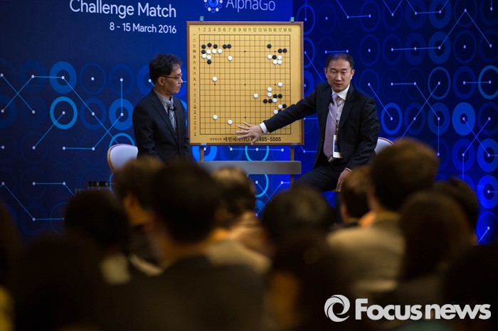 (서울=포커스뉴스) 한국 해설자들(왼쪽 김지명 캐스터, 오른쪽 김성룡 9단)이 15일 오후 서울 종로구 포시즌스호텔에서 구글 딥마인드 챌린지 매치, 인공지능 바둑프로그램 알파고와의 다섯번째 대국을 해설하고 있다.