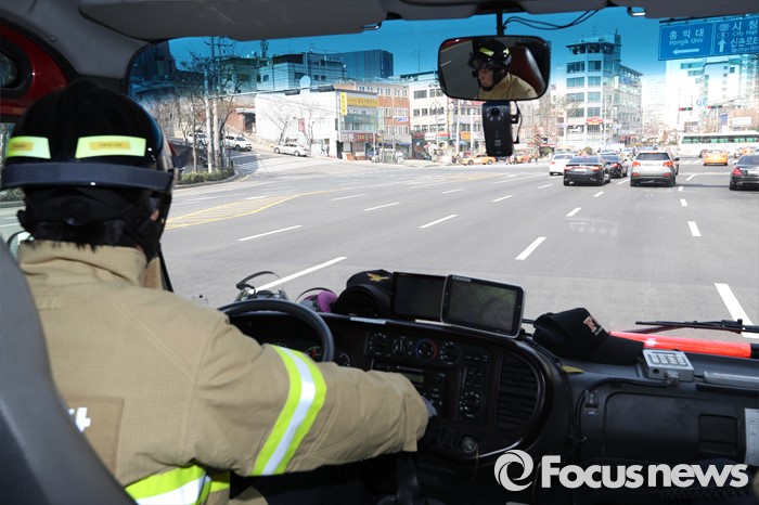 (서울=포커스뉴스) 올해 첫 민방위 훈련이 실시된 15일 오후 서울 마포대로 일대에서 마포소방서 소속 소방차가 길터주기 국민참여 훈련을 하고 있다.