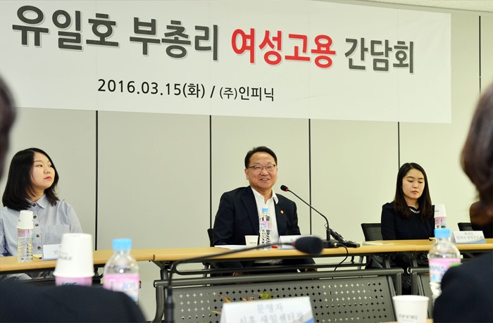 (서울=포커스뉴스) 유일호 부총리 겸 기획재정부 장관이 15일 서울 금천구 가산디지털단지 소재 인피닉(여성우수 중소기업)을 방문해 간담회를 갖고 있다. <사진제공=기획재정부>