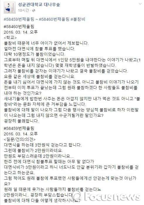 신입생을 환영하는 자리로 성균관대학교 수학교육과에서 선후배 대면식을 하는데 참가비가 3만원이고 불참해도 2만원의 '불참비'를 내야 한다는 것이다.