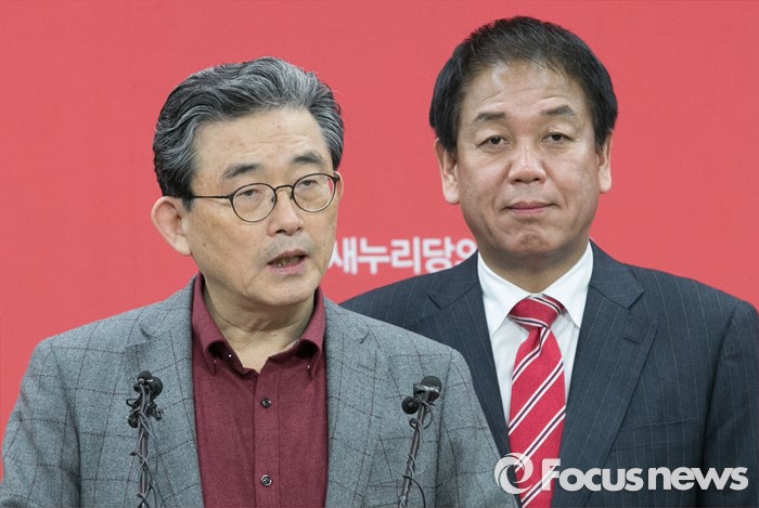 (서울=포커스뉴스) 이한구(왼쪽) 새누리당 공천관리위원장과 박종희 제2사무부총장이 15일 오후 서울 여의도 당사에서 20대 총선 3차 경선결과를 발표를 하고 있다. 이날 새누리당 공천관리위원회는 서울 종로구 선거구에 오세훈 전 서울시장이 경선 후보로 확정됐다고 전했다.