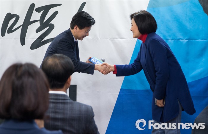 (서울=포커스뉴스) 노웅래 더불어민주당 의원이 15일 오후 서울 마포구 백범로 선거사무소 개소식에서 박영선 의원과 인사하고 있다.