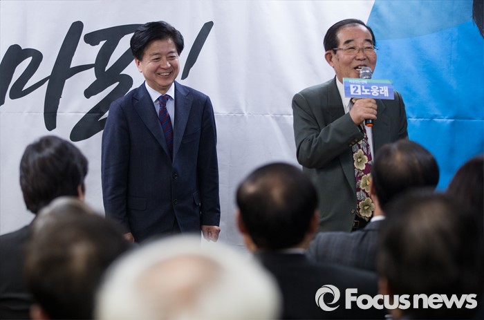 (서울=포커스뉴스) 김상현 더불어민주당 상임고문(오른쪽)이 15일 오후 서울 마포구 백범로 노웅래 의원 선거사무소 개소식에 참석해 축사를 하고 있다.