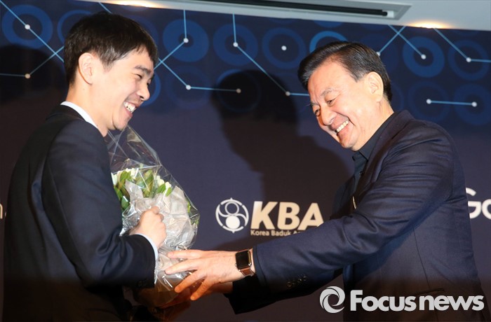 (서울=포커스뉴스) 15일 오후 서울 광화문 포시즌스 호텔에서 열린 구글 딥마인드 챌린지 매치 시상식에서 바둑기사 이세돌 9단이 홍석현 한국기원 총재에게 기념패를 전달받고 있다.