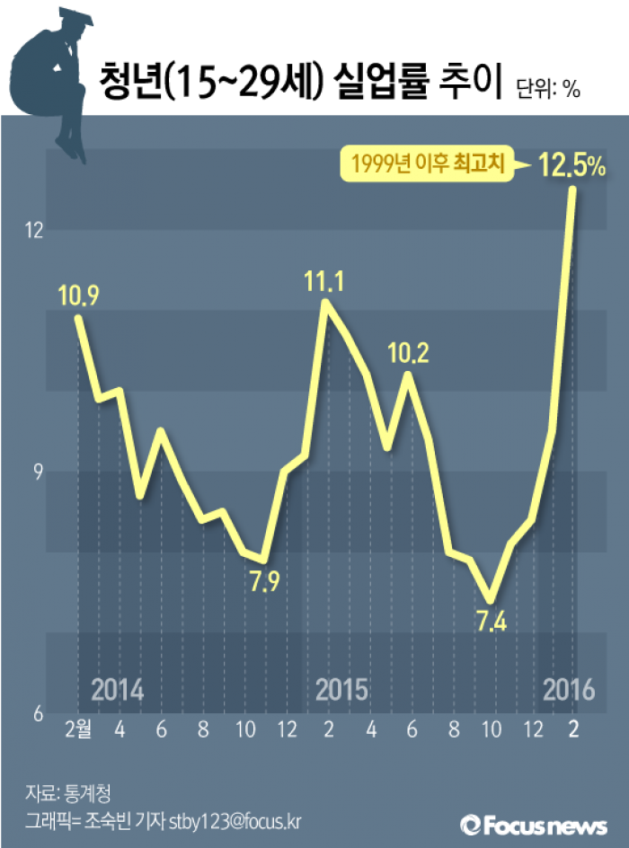 (서울=포커스뉴스) 16일 통계청이 발표한 ‘2월 고용동향’에 따르면 청년(15~29세) 실업률은 12.5%로 현재와 같은 통계를 작성하기 시작한 1999년 이후 최고치를 기록했다.