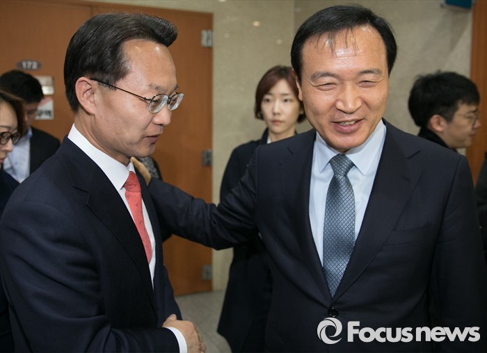 (서울=포커스뉴스) 공천 배제(컷오프)된 조해진(왼쪽) 새누리당 의원이 16일 오전 서울 여의도 국회 정론관 앞에서 공천관리위원회 결정에 반발하는 내용의 기자회견을 마친 뒤 후보 공천에서 탈락해 기자회견을 앞둔 임태희 전 의원과 만나 대화하고 있다.